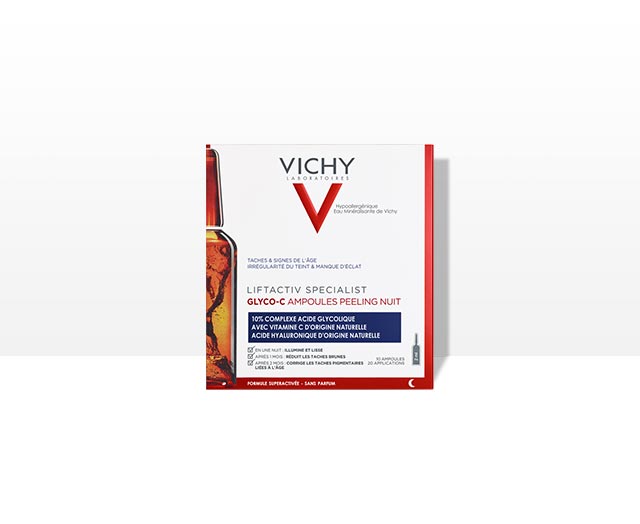 تركيبة مبتكرة تكافح علامات التقدّم في السنّ وتستهدف مختلف أنواع فرط التصبغ (مثل البقع الداكنة، التصبّغات الجلدية وعلامات حب الشباب)، من خلال أمبولة زجاجية واقية توفّر الجرعة اليومية المثالية لبشرتك. مياه فيشي الحرارية الفعالة غنية بمركّب نشط بنسبة 10% يحتوي على حمض الجليكوليك الذي يحدّ من ظهور البقع الداكنة بحسب أطباء الجلد وفيتامين جلوكوسيد الأسكوربيل.